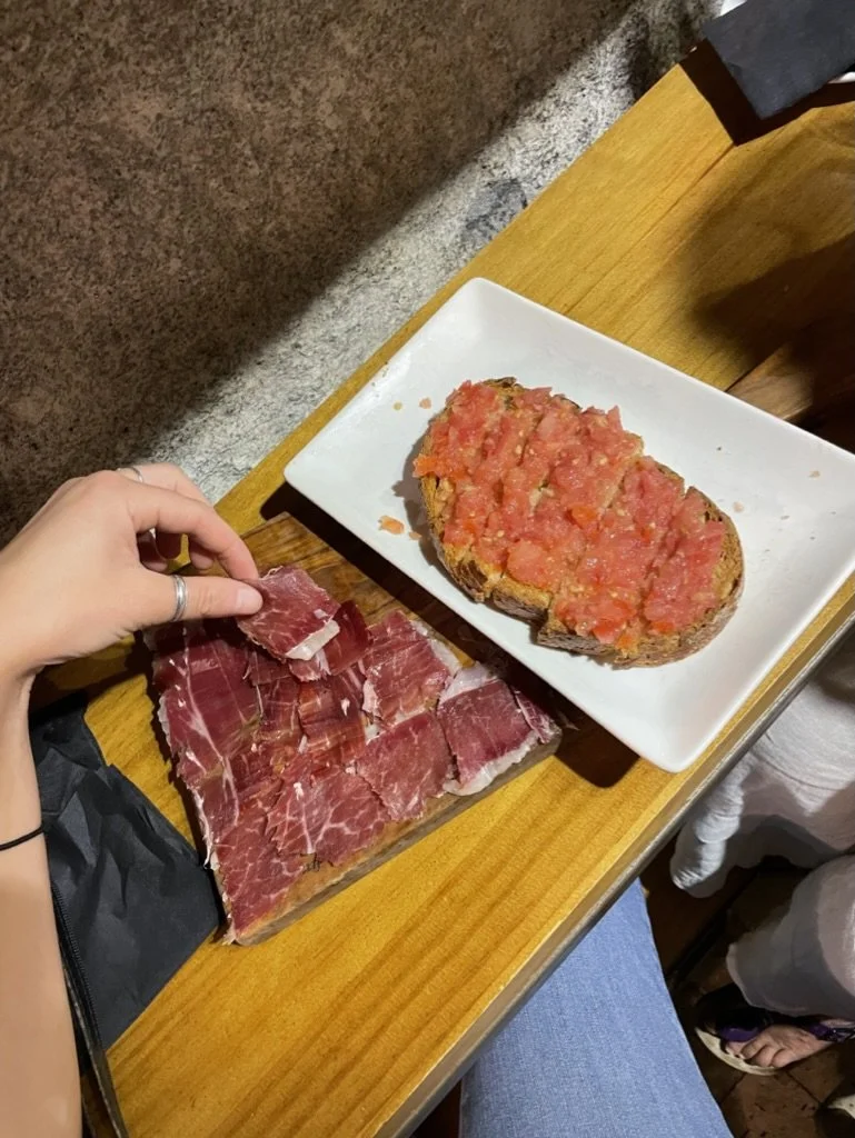 The more atypical menu items are their salads—arugula with mandarin slices, goat cheese, and a balsamic glaze—that seem to favor a younger, more plant-focused clientele. A hightop seats two audibly American women, maybe in their mid twenties, who stare at others in the window reflections. Behind them, among a loud group of boys; all but one are from Spain, and the last seems to be a friend visiting from London. In the back corner a couple is seen kissing, almost egregiously.